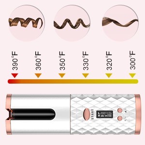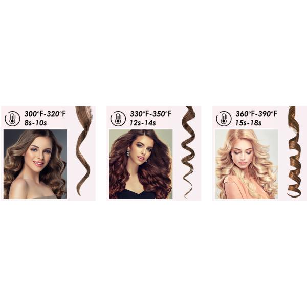 Wavy curlsFor fragile or damaged hair , it is recommended to set the temperature at 300℉-320℉ (150 ℃-160 ℃) and curls for 8 to 11 seconds. | Loose curlsFor soft or healthy hair, it is recommended to set the temperature at 330℉-350℉ (170 ℃ -180 ℃), and curls for 11 to 14 seconds | Tighter curlsFor thick and coarse hair, it is recommended to set the temperature at 360℉-390℉ (180 ℃ -200 ℃), and curls for 14 to 18 second |