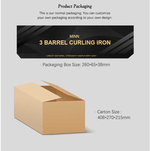 Specification | Ultra fast heat up Ceramic barrel + Shiny shell/rubber handle 360° swivel cord Technical Parameters:120-240V 50/60Hz 50W Temperature:185℃-210℃ Temperature display:LED Heater Type:PTC Product size:L256mm×W52*H55mm Barrel size: L115*φ13mm Product weight: 220g Can customized package,color and logo CE ROHS Certificate |