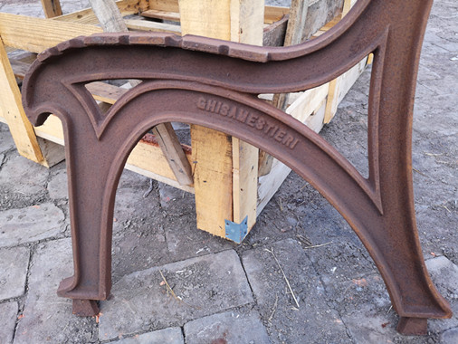 Long outdoor wooden bench with cast iron bench ends for street furniture