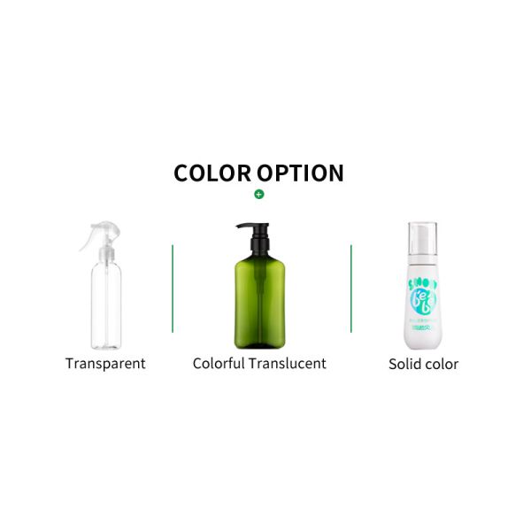 Transparent: Bottles that are transparent look clear. Light passes through transparent bottles, so you can see through them. Clear color is commonly used in cosmetic and beauty products to allow the customer to see the product before purchasing it.