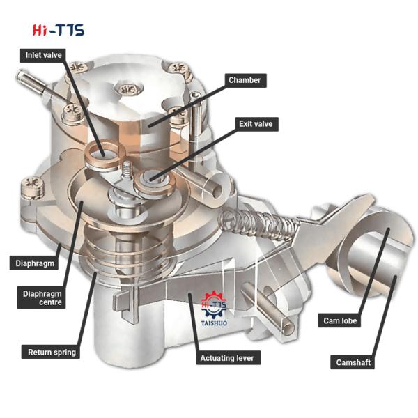 When the lever pulls the diaphragm down, it creates suction that draws fuel along the fuel pipe into the pump through a one-way valve .