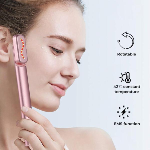 1. Multi-effects in one. The instrument has sonic vibration, micro-current, red light skin rejuvenation, 42°C hot compress, and the head can be rotated 270°. Use with eye cream or serum to improve eye bags, eye lines, dark circles