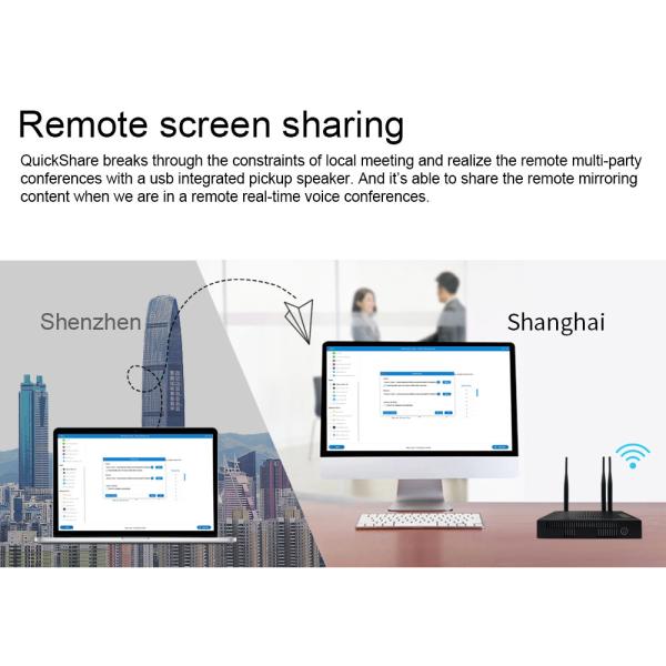 Quickshare is a wireless presentation system that enables any employee or visitor to share a conference room or huddle room projector or panel in just seconds simply by plugging in their notebook and pressing a button. Ideal for both shared work-spaces and enterprise collaboration, its plug and play design means there are no apps to install, and no special network to join or configure and installs in just minutes. Designed for use by both small companies and enterprises, uses wireless encryption for secure collaboration to protect from confidential information being seen or recorded by a third party. enables instant collaboration out of the box with one/two/four buttons and can support up to 8 different presenters or sources with the purchase of additional buttons. can be installed in any meeting room in just a few minutes without the need of IT network configuration or support . It's elegant modern and sleek design and looks good on any conference room table. delivers efficient meetings by showing a crisp Full HD 1080p image to any projector, monitor, or flat panel, and has a special video mode button on each transmitter to enable smooth playback of multimedia content without impacting network bandwidth.