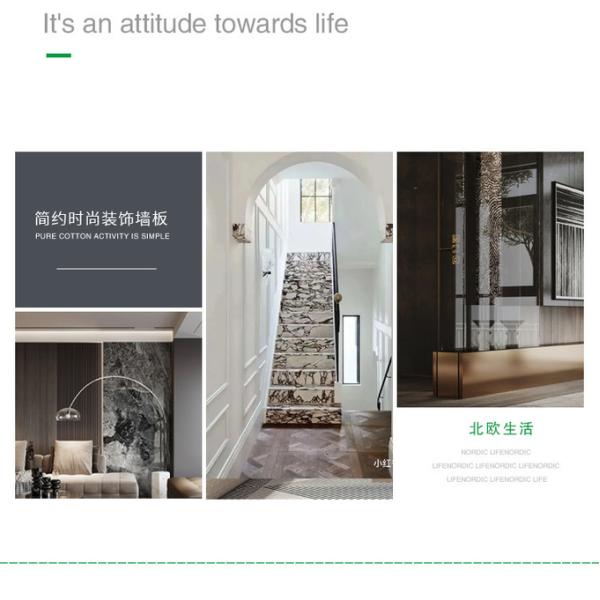 Waterproof and Moisture Resistant Bamboo Charcoal Marble Wall Panels are ideal for interior decorating, especially for areas that need to be waterproof and moisture resistant. These wall panels offer excellent moisture resistance for high humidity areas such as bathrooms, kitchens and basements without warping, swelling or deteriorating. Bamboo charcoal veneer provides durability, strength and resistance to abrasion, maintaining structural integrity even in high humidity environments. Waterproof bamboo charcoal marble wall panels incorporate bamboo charcoal wood veneer and PVC marble patterned overlays, presenting a visually striking and luxurious appearance that adds depth and character to the panels and enhances the overall aesthetics of the interior space. In addition, this type of wall paneling is often easy to clean and maintain, simply wiping it down with a damp cloth or mild detergent to remove dirt and stains, ensuring that it stays fresh and beautiful for a long time.