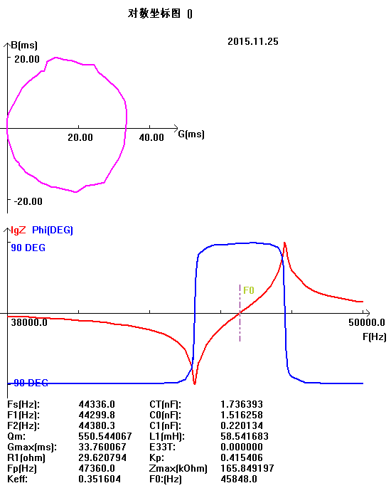 Impedance measurement of piezoelectric devices is a prerequisite for the correct use of the device. For piezoelectric devices, by the impedance analyzer can get the main parameters, including resonant frequency FS, anti resonant frequency FP, half power point of F1 and F2, maximum admittance Gmax, electrostatic capacitance C0, dynamic reactor R1, dynamic capacitance C1, dynamic inductance L1, free capacitance CT, free dielectric constant, mechanical quality factor QM, mechanical and electrical coupling coefficient keff, KP, K31, k33, and can draw pressure electric device five characteristic curve (admittance characteristic diagram, characteristic impedance, admittance polar pattern and impedance polar diagram, logarithmic plots).