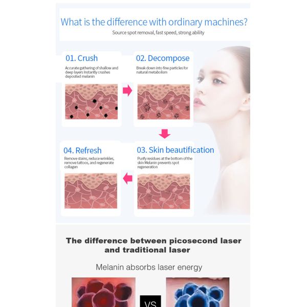 4. Tattoo and Pigmented Lesion Removal: Picosecond lasers have become an essential tool in the field of dermatology for tattoo removal and treatment of pigmented lesions. The ultra-short pulses of the laser effectively target and fragment the pigmented particles, breaking them down into smaller fragments that can be naturally eliminated by the body. This technology has revolutionized tattoo removal, allowing for faster and more efficient clearance of tattoos with reduced risk of scarring or damage to the surrounding skin.