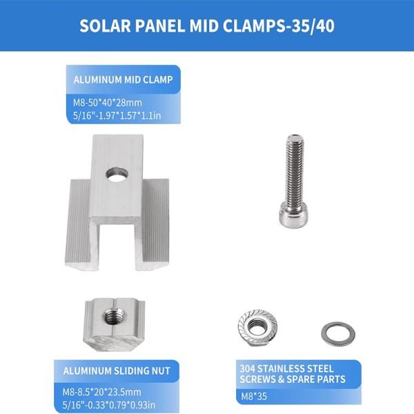 This solar panel mid-clamp is reliable and safe, and is designed to last for years. It provides a secure and stable connection for your solar panel, ensuring a strong and long-lasting installation. The material used is corrosion-resistant and has excellent insulation properties, making it ideal for outdoor use. This solar panel mid-clamp has been tested to meet the highest standards in the industry, making it the perfect choice for any solar panel installation project.
