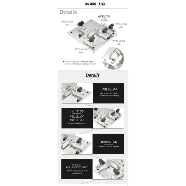 The AFKLOK WL400-D Changeover Manifold is the perfect choice for gas control panel, gas supply systems distribution, and other gas control applications. Constructed of high-grade stainless steel 316, the 1/2 inch Changeover Manifold offers superior corrosion resistance and durability. It features a ferrule connection type that allows for a secure connection and ensures a high-pressure seal. With a working pressure of up to 10MPa, this silver Changeover Manifold offers an efficient and reliable gas distribution solution for any application.