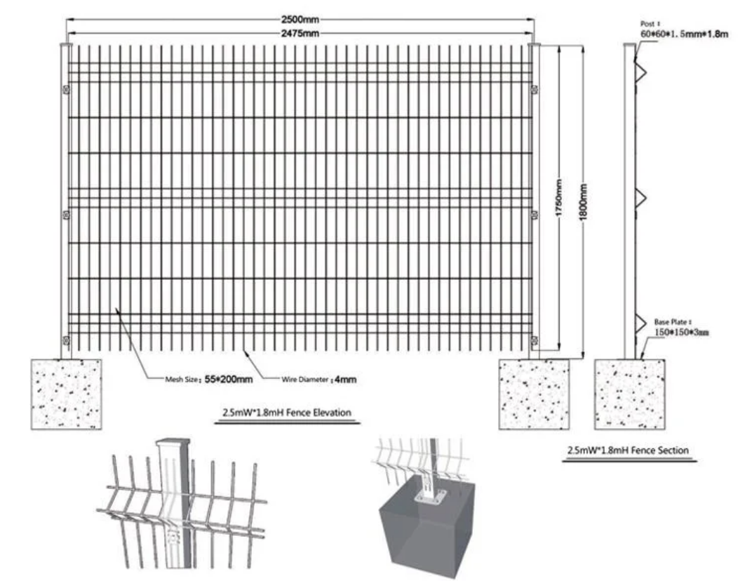 50*100mm 50*200mm 55*100mm 55*200mm | 4mm 5mm | 830mm | 2m 2.2m 2.4m 2.8m 3m | 2 | Green RAL 6005 Grey RAL 7016 Brown RAL 8019 Black RAL 9005 White RAL 9010 | 1.Hot dipped galvanized after black wire welded 2.PVC coated after galvanized wire welded 3.PE coated after galvanized wire welded 4.Powder coated after galvanized wire welded |
