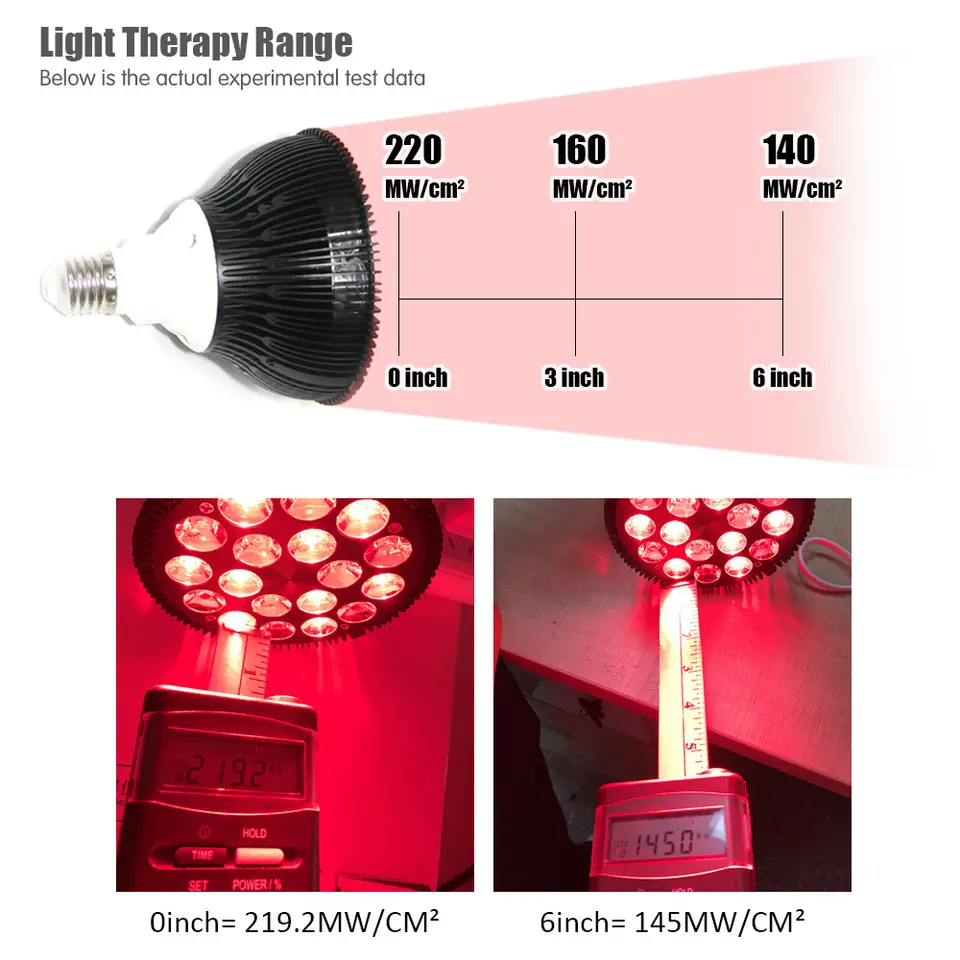 About this item LED Red Light Therapy Lamp: 660nm red and 850nm near infrared combo light, making it the best wavelength for light therapy. Infrared light is invisible to the naked eye so when using this bulb only half of the chips will appear illuminated. Complete Infrared Light Therapy Set: Comes with lamp holder for convenient use. Enjoy light therapy at home or office and make your life better. Non-Invasive Pain Relief: Designed to deliver infrared heat to the body. The infrared heat encourages muscles and damaged tissue to heel. Durable to use: The high power led light therapy bulb has built-in qualified heat sink for better heat dissipation, durable to use.