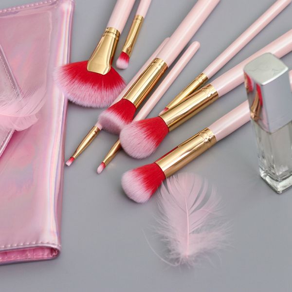 8 Pieces Travel Friendly Makeup Brush Set Pink Brushes With Rainbow Cosmetic Bag