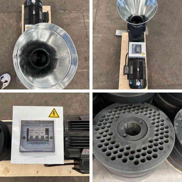 Pelletizing process: The material is fed into the granulation chamber and rotated by the friction roller of the mold. This forces the material to be extruded into the hole of the mold, then compacted into a cylindrical strip, finally cut by the cutter at the outlet and turned into pellets. The finished granules then roll out of the granulation chamber.