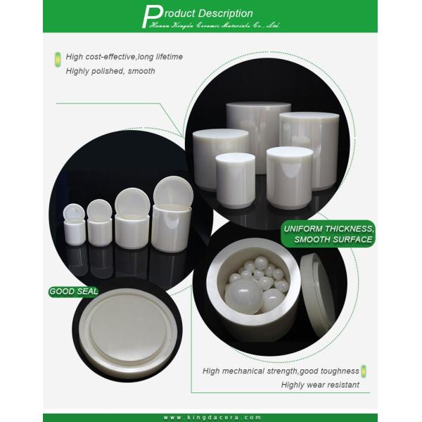 Highly polished YSZ (Yttrium stabilized ZrO2) zirconium oxide jars, 60 times the hardness of regular steel, highly wear-resistant and resistant to acid and solvents. The grinding jars are extensively applied on in the fields of Paint, Ink,Coating, Geology, Metallurgy, Electronics, Construction Material, Ceramics, Chemical Engineering, Light Industry, Medicine, Environmental Protection and so on. Each jar set includes grinding jar, jar lid, rubber sealing gasket and different sizes of mixed zirconium oxide grinding balls.
