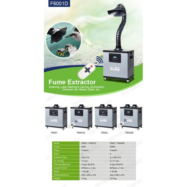 F6001D Industrial Fume Extractor is use for clean air during Soldering , Laser Marking & Carving , Moxibusiton , Chemical Lab , Beauty Salon , etc .