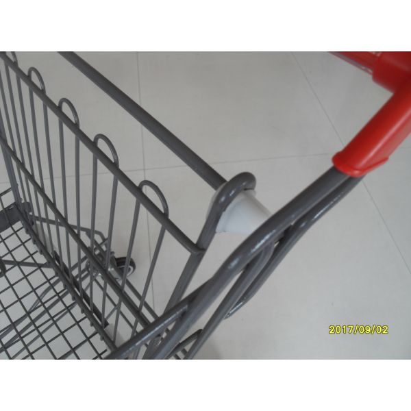 For surface treatment,we use zinc plated with clear powder PPG coating.It can help shopping carts to provent from rust and corrosion prblem and last trolleys' life.For caster,we use good material PU,TPE,PVC and have 4or 5inch,flat for travelator ones for customer's choosement.For plastic parts,we use anti-UV material for protect plastics from color fade.Front of trolley can be installed with plastic advertisement board.