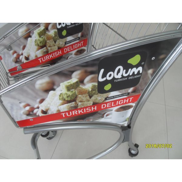3) Parts available: 3 sides Basket edges cover,baby safety belt,plastic advertisement board,customized logo on handle,coin lock