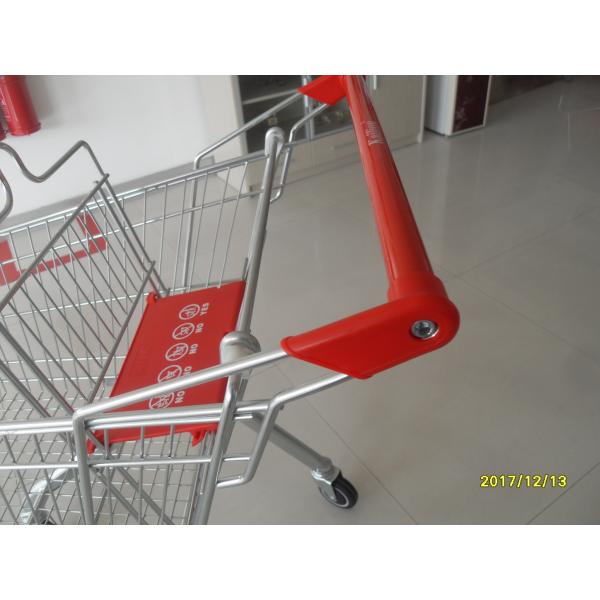 For surface treatment,we use zinc plated with clear powder PPG coating.It can help shopping carts to provent from rust and corrosion prblem and last trolleys' life.For caster,we use good material PU,TPE,PVC and have 4or 5inch,flat for travelator ones for customer's choosement.For plastic parts,we use anti-UV material for protect plastics from color fade.Front of trolley can be installed with plastic advertisement board.