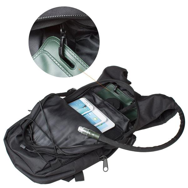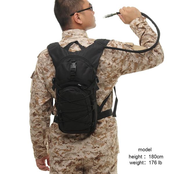 New hydration backpack with 3.0L water bladder included. Features 2 front pockets in addition to water bladder compartment. Made from tough 600D polyester fabric. Additional Molle webbing makes this little hydration pack even more versatile. Bladder holds 3.0L and features a Big Mouth opening and a matching covered sleeve for the drinking tube.