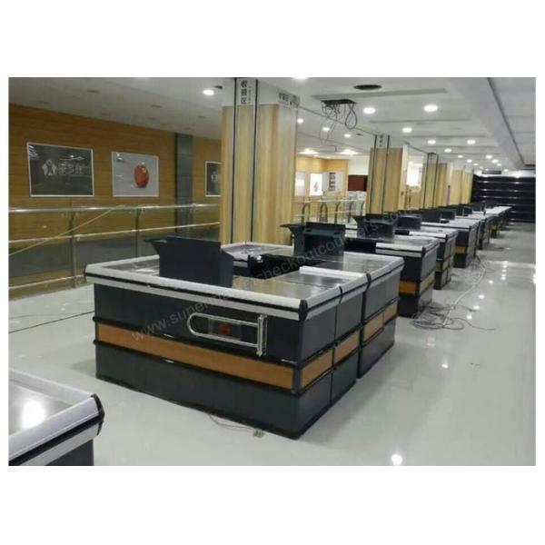 Wooden And Steel Automatic Cashier Checkout Counter / Supermarket Checkout Counter With Conveyor Belt