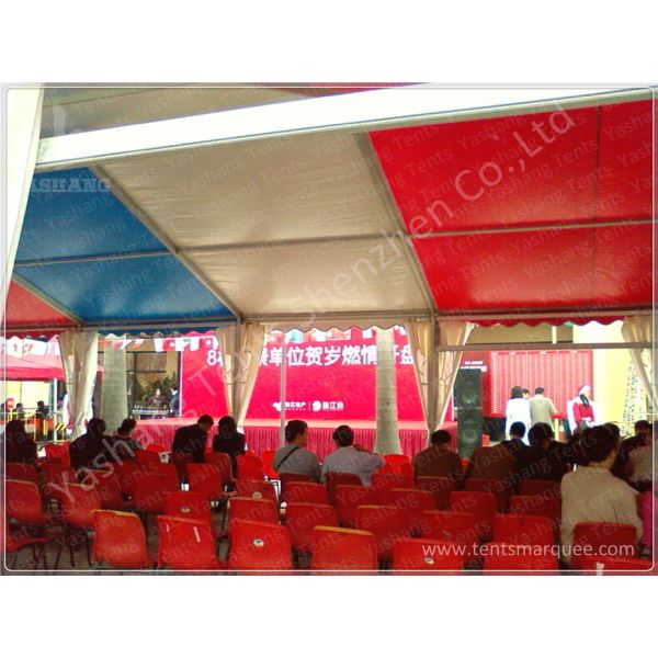Standard outdoor fabric tent event structure normally comes with white uv resistant double PVC-coated polyester textile roof top and side walls. Actually, event tent fabrics are available in many colors. As you can see in this outdoor event tent project, the customer configures their portable aluminum frame sunshade construction with colorful fabric roof covers. A variety of different colors spaced out one another, gives an innovative and eye-catching appearance.