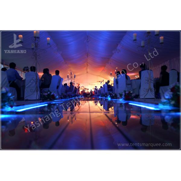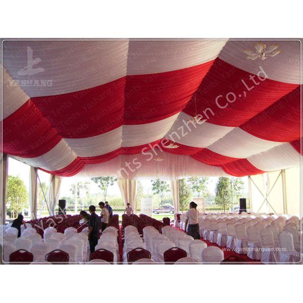 Medium aluminum high peak wedding tent with lining decoration system is top welcome by the high grade gorgeous outdoor events, such as wedding party, festival exhibition etc. Tent accessories with pleated decoration lining and clear windows.