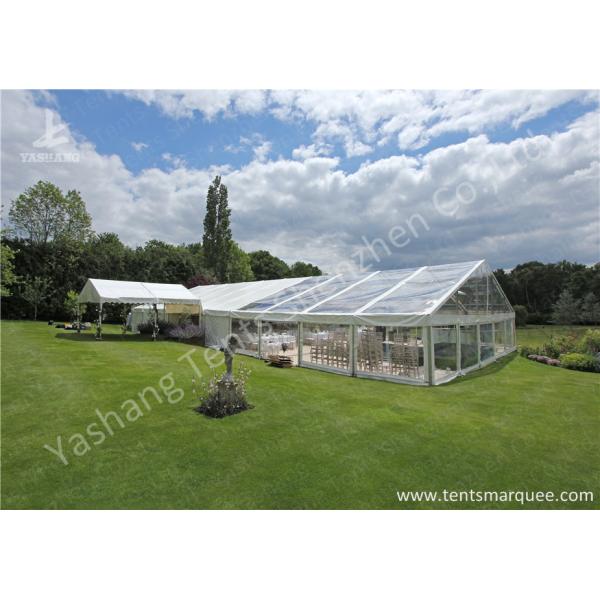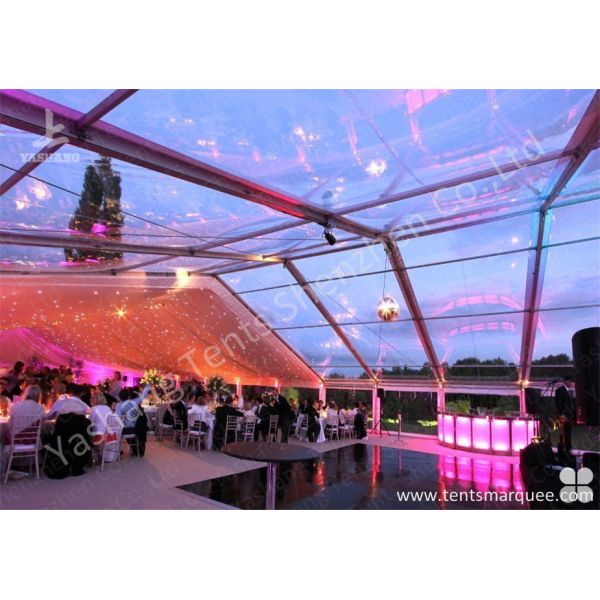 The large 25m x 50m aluminum stucture frame tent goes with UV resistant white and transparent tarpaulin on top and sidewalls. The white and transparent canopy marquee cover tent is built on the surface of grassland for a celebration party event. The white fabric is more durable than transparent fabric, but there're still many customers like to use transparent tent canopy for their outdoor weddings and other parties, as more and more people are inclined to integrate the event atmosphere into the surrounding environment.