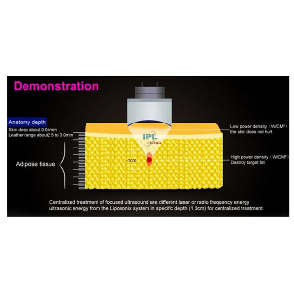 High Intensity Focused Ultrasound penetrates focused and volumetric ultrasonic energy at precise depth in subcutaneous fat layers targeting fat tissue causing a non-thermal effect. The surrounding structures such as the epidermis, blood vessels and nerves will not be damaged. Meanwhile the metabolized contents (triglyceride, fatty acid) of cells will excrete outside body automatically through blood circulation and lymphatic drainage without harm to the human body