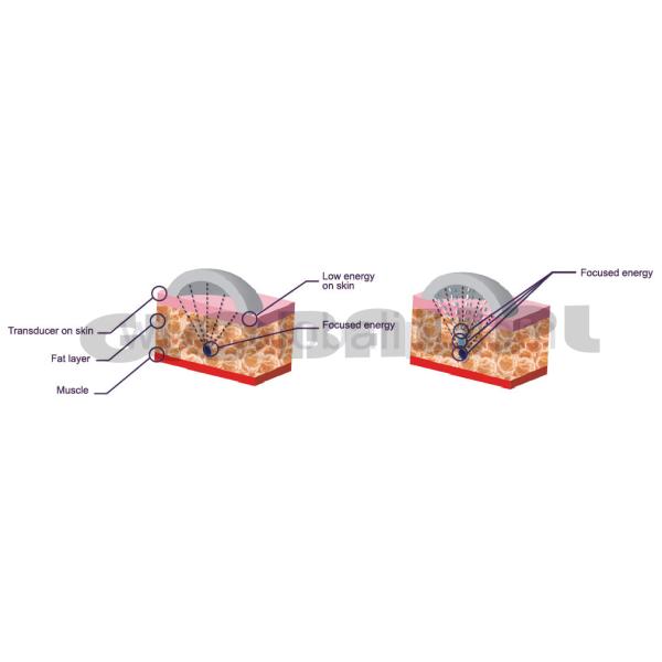 High Intensity Focused Ultrasound penetrates focused and volumetric ultrasonic energy at precise depth (1.2 cm) in subcutaneous fat layers targeting fat tissue causing a non-thermal effect. The surrounding structures such as the epidermis, blood vessels and nerves will not be damaged. Meanwhile the metabolized contents (triglyceride, fatty acid) of cells will excrete outside body automatically through blood circulation and lymphatic drainage without harm to the human body.