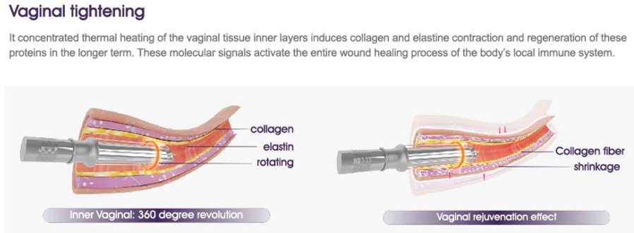 It concerntrated trearmal heating of the vaginal tissue inner layers induces collagen and elastine contraction and regeneration of these proteins in the longer term. These molecular signal activate the entire wound healling process of the body's local immune system. The treatment outcome is the complete remodeling of the vaginal tissue in addition to re-establishment of firm "young like" vaginal tissue embedded with string-like, thick and long collagen fibers.