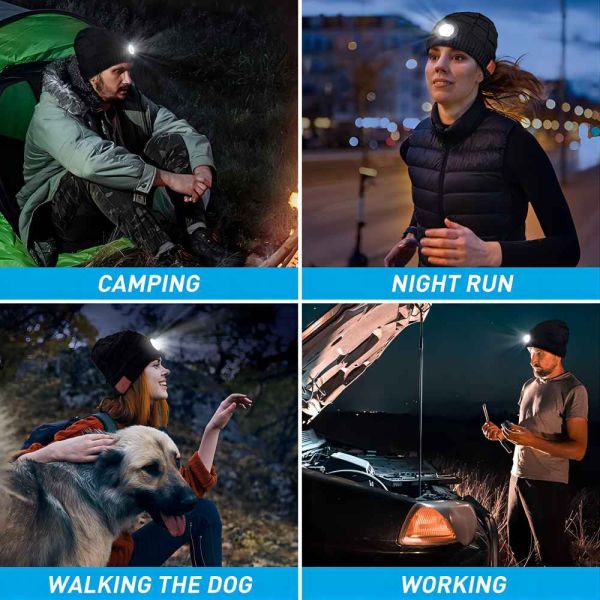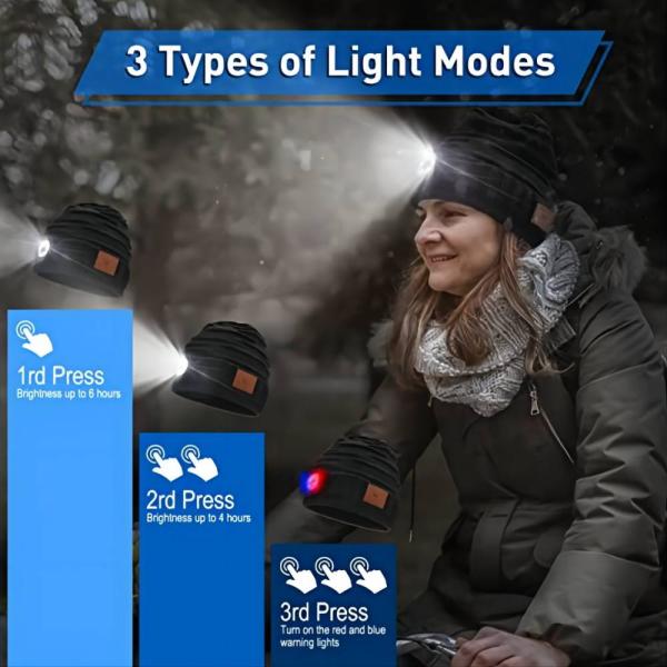 1, Bluetooth Beanie Hat with Light- 3in1 Features-Warm hat,Earphones,Flashlights
