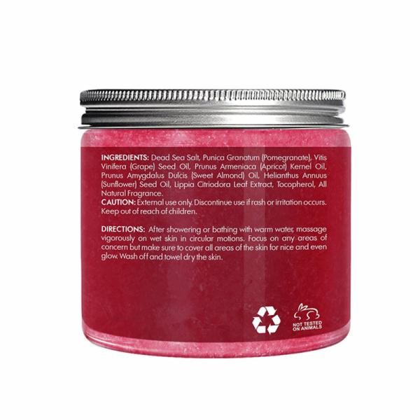 | Main Ingredient | Dead Sea Salt, Pomegranate, Grape Seed Oil, Apricot Kernel Oil, Sweet Almond Oil, Sunflower Seed Oil, Lippia Citriodora Leaf Extract, and Tocopherol. |