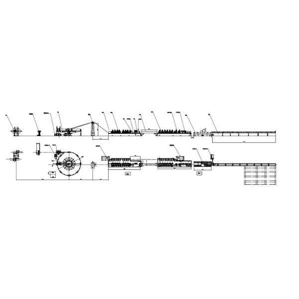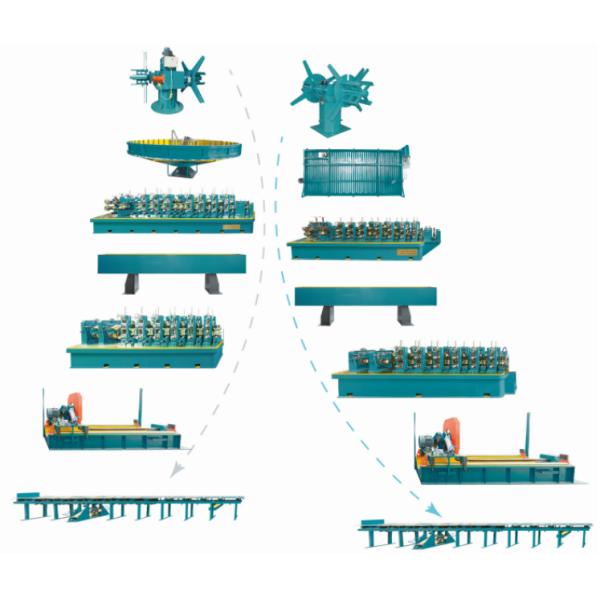uncoiling→shearing and butt welding→material accumulating→flattening→forming system→high frequency induction welding machine→inside and outside burr removing frame→water cooling system→sizing system→leveling system→speed testing→Turkish frame→saw cutting→running out table