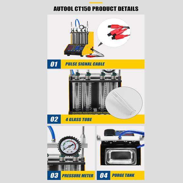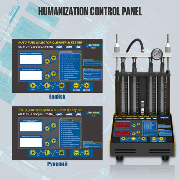 CT150 Car Fuel Injector Tester Cleaner is a professional 4 cylinders auto fuel injector testing cleaning machine. It will help us clean and test the injectors of gasoline cars and motorcycles. Support for more cars and motorcycles.Can only be used to clean diesel fuel injectors.The cleaning fluid is 3M car injector cleaning fluid, and the test fluid is industrial alcohol.Its working voltage range is 110-230V.CT150 Car Fuel Injector Tester Cleaner has two versions: Russian and English.