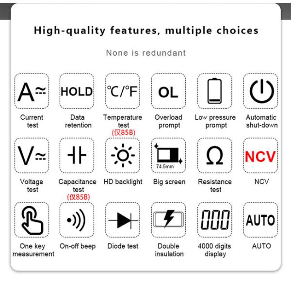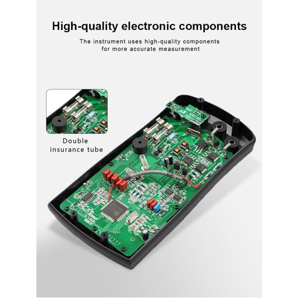 The handheld smart instrument is driven by battery without the range/function knob. It has the function of measuring DCV, ACV, DCA, ACA, Resistance, Diode and Buzzer.