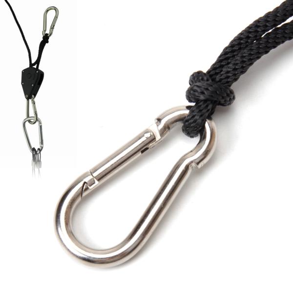 Rope Ratchet light hangers are one of the easiest ways to hang grow light reflectors and other indoor garden equipment, like carbon filters. No more dealing with adjusting chains or tying and re-tying ropes. The Hanging Ratchet Light Hangers simplify the process of securing fans, filters, reflectors, and any other suspended object that you can imagine. The lock mechanism quickly and securely fastens ropes into place. Simply tap the release button to unlock the Hanging Ratchet Light Hangers. The Hanging Ratchet Light Hangers are sold in pairs. These Rope Ratchet hangers come with 7 feet of 1/8-inch braided polypropylenne rope and support 75 pounds each. Each pair of ratchet hangers can handle a maximum of 150 pounds (68 kg).