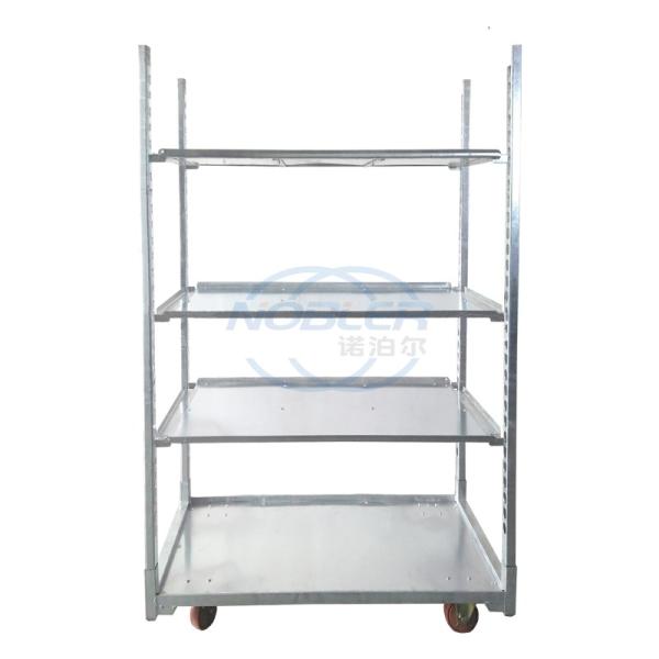 The metal sheet flower trolley consists of 1 base(and 4 wheels), 4 posts, and 3 shelf .