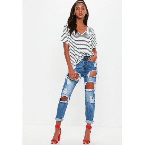 White and Navy Striped V Neck Boyfriend Clothing T Shirt Women