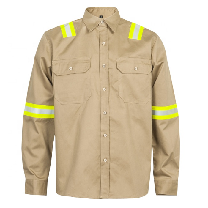 This 100% Cotton FR Reflective Welding Shirt Fire Retardant Work Shirt For Welding, made by 100% cotton FR twill fabric, 7.5oz FR Khaiki color fabric, with buttons front closure , nice shape , FR hi-vis 5cm width reflective tape for shoulder and arms . adjustment cuffs by buttons.