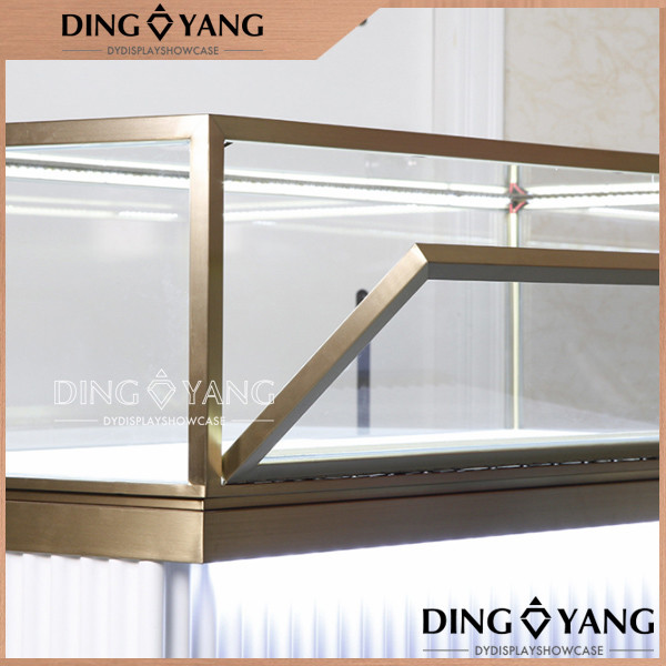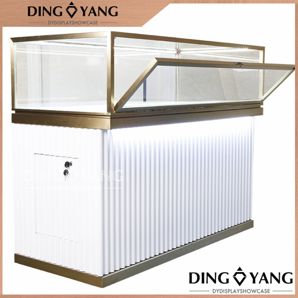 This Fashionable Jewelry Showcase Is Finished By Gold Electroplating and matte white lacquer, The current size is 1350X550X960MM and can be customized other size as you need, 1/4 view stainless steel frame covered with8MM~10MM clear tempered glass panels and all sides. Led strip lights hidden in the metal frame. The lights can be 2700K~6500K (Light Colors Can Be Choosed), Each Fashionable Jewelry Showcase has installed the reducer that hidden under the jewelry showcase. Bottom Large wooden Storage With Locks,. Additional Wood Shelf inside. Factory Manufacturers Suppliers Custom With High Quality Competitive Price