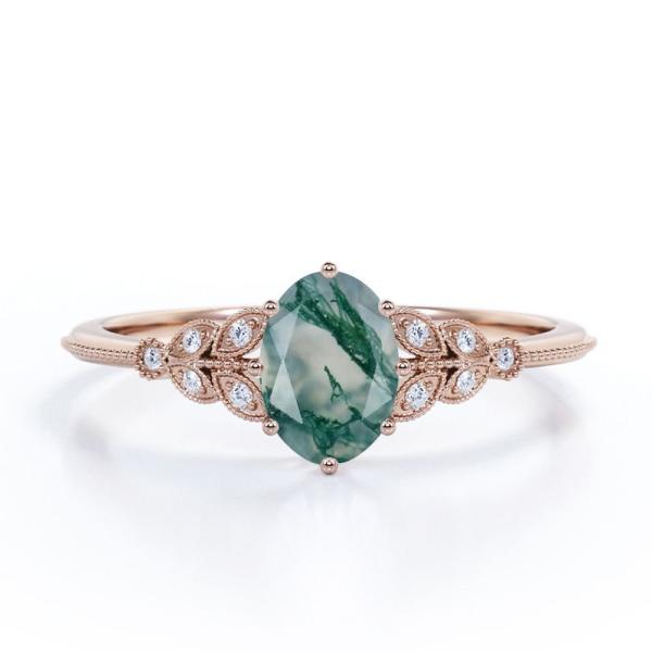 Marquise-shape Filigree Milgrain Ovate Natural Druzy Moss Green Agate And Moissanite Cluster 6 Prong Engagement Ring