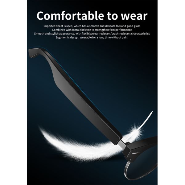 The lenses on your smart audio sunglasses are UV protected to keep your eyes healthy, defend them from the sun’s rays. They’re also polarized to significantly decrease sun glare, giving you full clarity of vision and allowing you to always see where you’re going. Your audio glasses are comfortable and easy to use . Also , you can choose anti blue ray to protect your eyes from the computer , mobile phone or TV sets