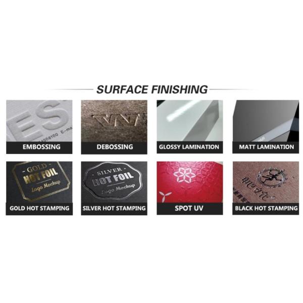 Logo type | 1) Glossy/Matte lamination 2) Complete or Spot UV 3) Embossing and Debossing 4) Gold or silver foil stamping 5) Varnishing |