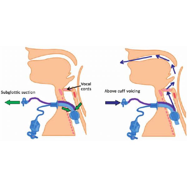 Tracheostomy tube in situ with subglottic suction ports and tubing indicated. Left-hand figure demonstrates the usual removal of secretions by aspiration. Right-hand figure demonstrates the flow of gas to the upper airways via the larynx when additional gas flow is directed into the subglottic port.