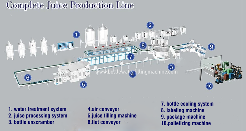 The complete line includes: RO water treatment, beverage processing equiment, blow molding machine,