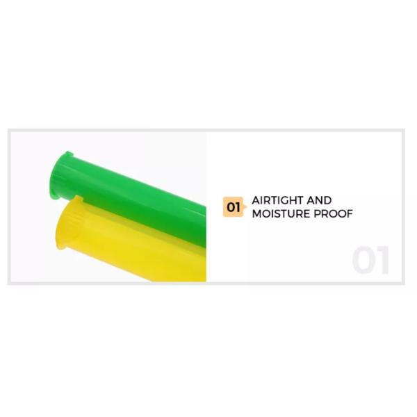 Our glass tube is made of high quality PP material. It is child resistant compliant with ASTM D3475-18.This tube is widly used to pack prerolls, pills, and dried flowers. It can prevent children from reaching the content in it, and lock in freshness for an effective long-term storage solution.