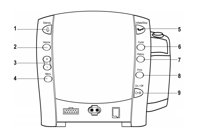 5. Inflate/Stop button: starts a manual NIBP determination or stop any NIBP determination.