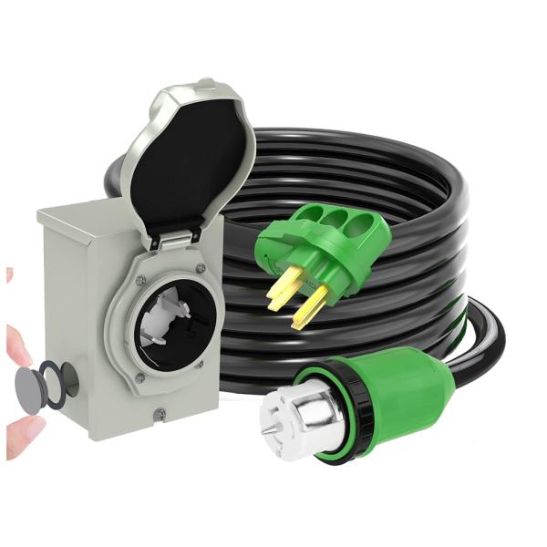 What do you get :1 x 50 amp generator power cord (15 ft)+ 1 x 50 amp generator Inlet Box (pre-drilled)+ 1 x cable tie + 1 x storage bag
