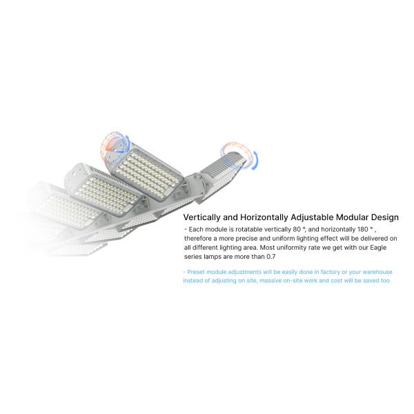 Patented EAGLE series LED sports lights have an elegant appearance with die-cast modules, IK rating is IK08 Vertically and horizontally rotatable heat sink design makes every module flexibly targeting to specified point to get much better light uniformity on sports field. Upward light ratio=0 for light fixture with symmetrical beams and spill covers Upward light ratio=0 for light fixture with asymmetrical beams Optional long distance wireless control system and DMX control system