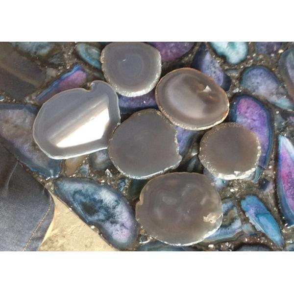 natural agate stone coasters such as oval and round are available.There are many colors for customers to pick up,such as natural color,red,grey,pink,blue,orange,green,purple,black and white and so on.Among so many colors,original white color is the most popular color.As for edge of coasters,besides plain edge,edge plated in gold and silver are also welcome recently.The size of agate slice cossters can be customized,usual sizes are 10cm,15cm,20cm about.Size about 10cm is the most pupular size for tea cup coasters and coffee cup coasters.We can add bumpers on the bottom of agate slice coasters for customers if they want.