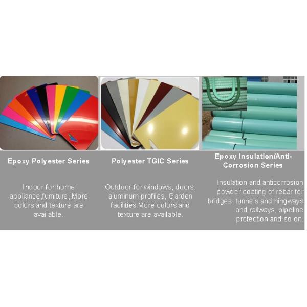 Thermosetting epoxy/polyester powders with a great variety and wide selection of colors, include a series of produces such as standard curing, rapid curing and low-temperature curing powders with high gloss, semi-gloss, matt, metal and transparence finishes.
